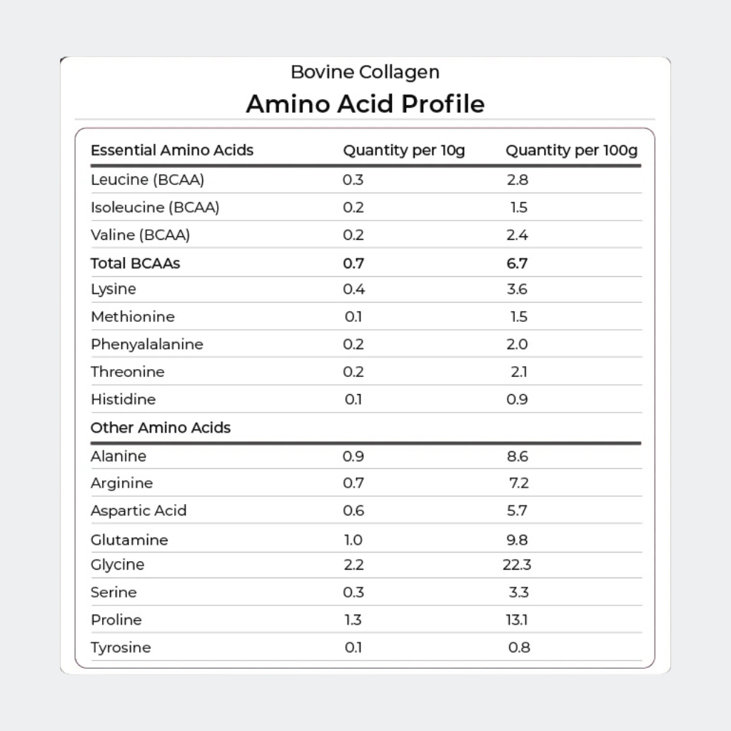 A hydrolysed bioactive collagen peptide powder containing 9.95g of pure collagen per serve, plus 50mg of Vitamin C to support collagen synthesis and provide antioxidant benefits. The collagen peptides are low molecular weight (2kDa), broken down through a natural enzymatic process, which means fast absorption and high bioavailability. It's Type I and Type III collagen, sustainably sourced, and contains 16 amino acids including 3 BCAAs and all 8 essential amino acids.